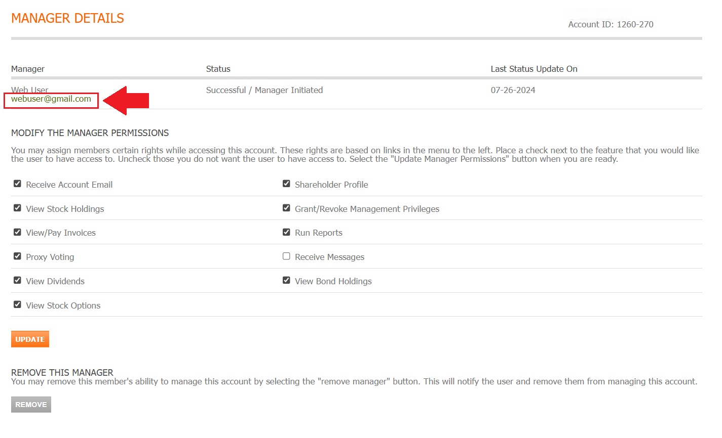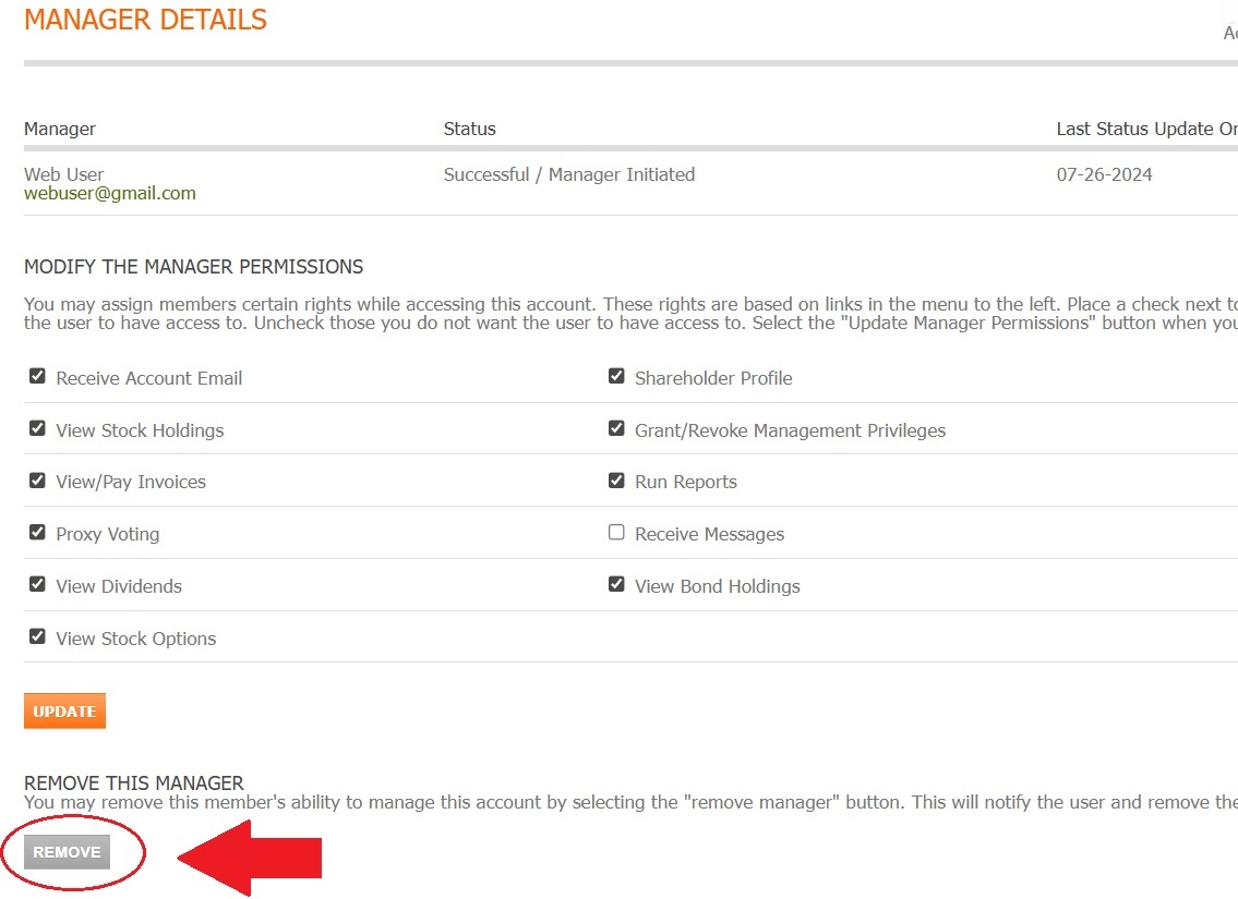 Locate and click the Remove button to revoke all access for this manager.