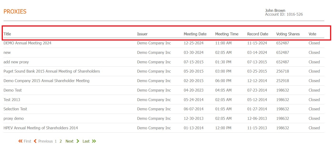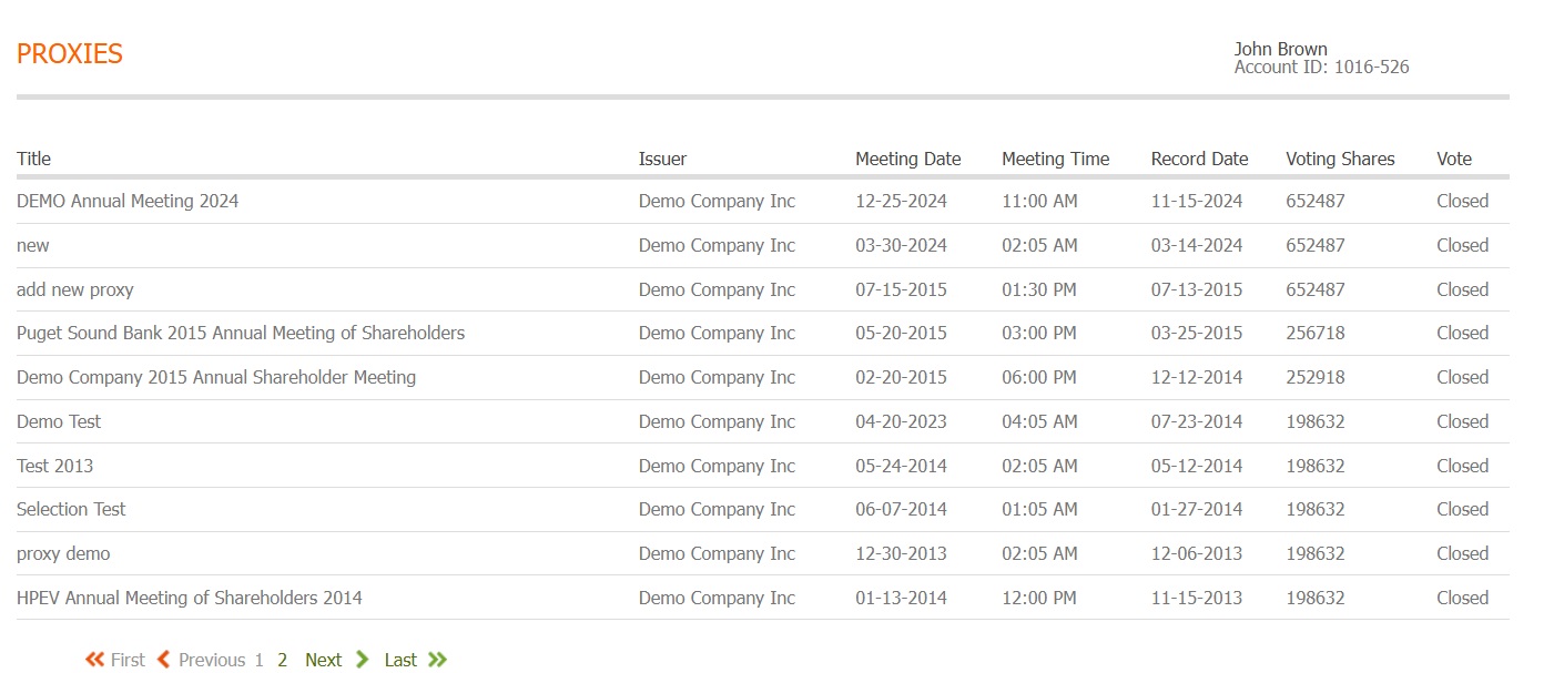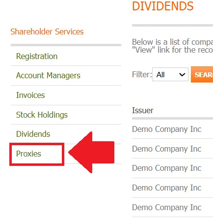 Upon entering the Proxies section, you’ll see information about shareholder meetings.