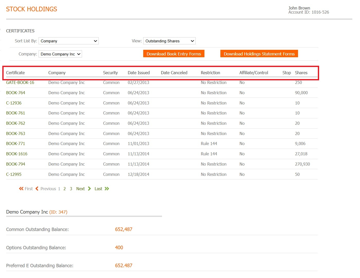 The dashboard displays all your holdings across different companies and security types. Each holding shows key information including certificate numbers, share quantities, and current status.