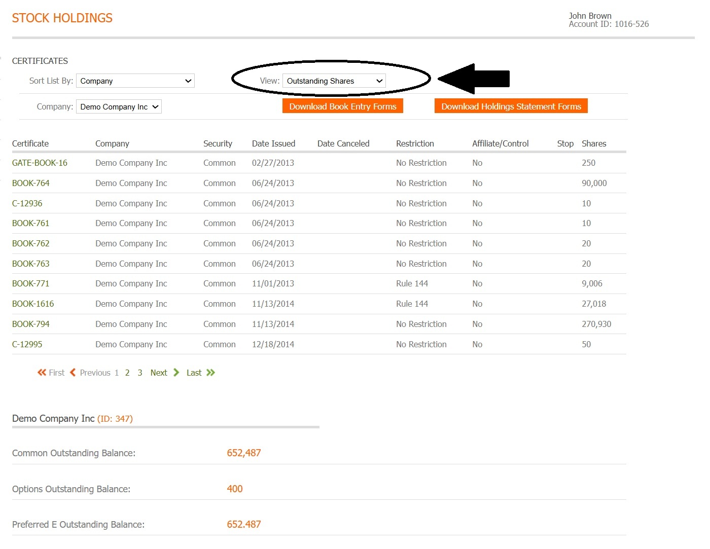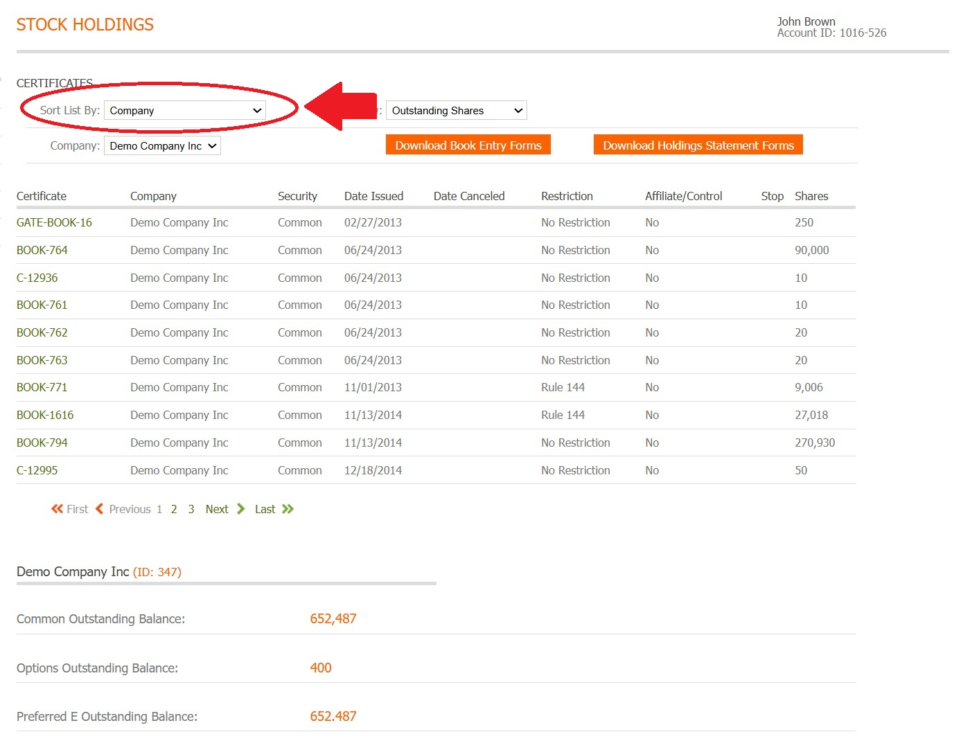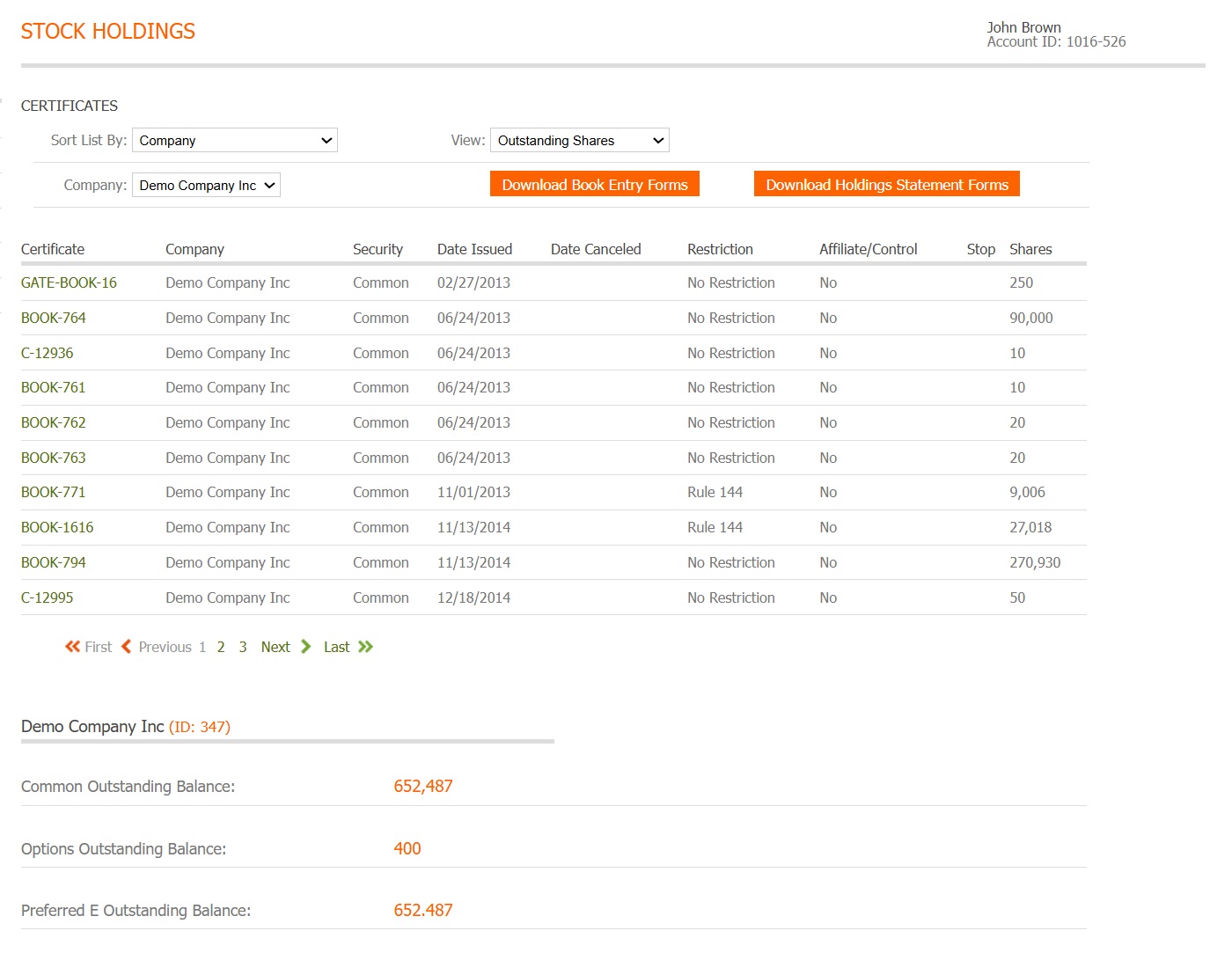 The View Holdings feature provides a comprehensive display of all your stock certificates and positions across your investment portfolio. You can filter, sort, and examine detailed information about each holding.