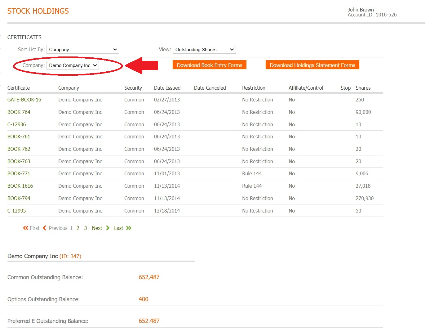 Click the company dropdown menu to see a list of all companies where you hold investments.